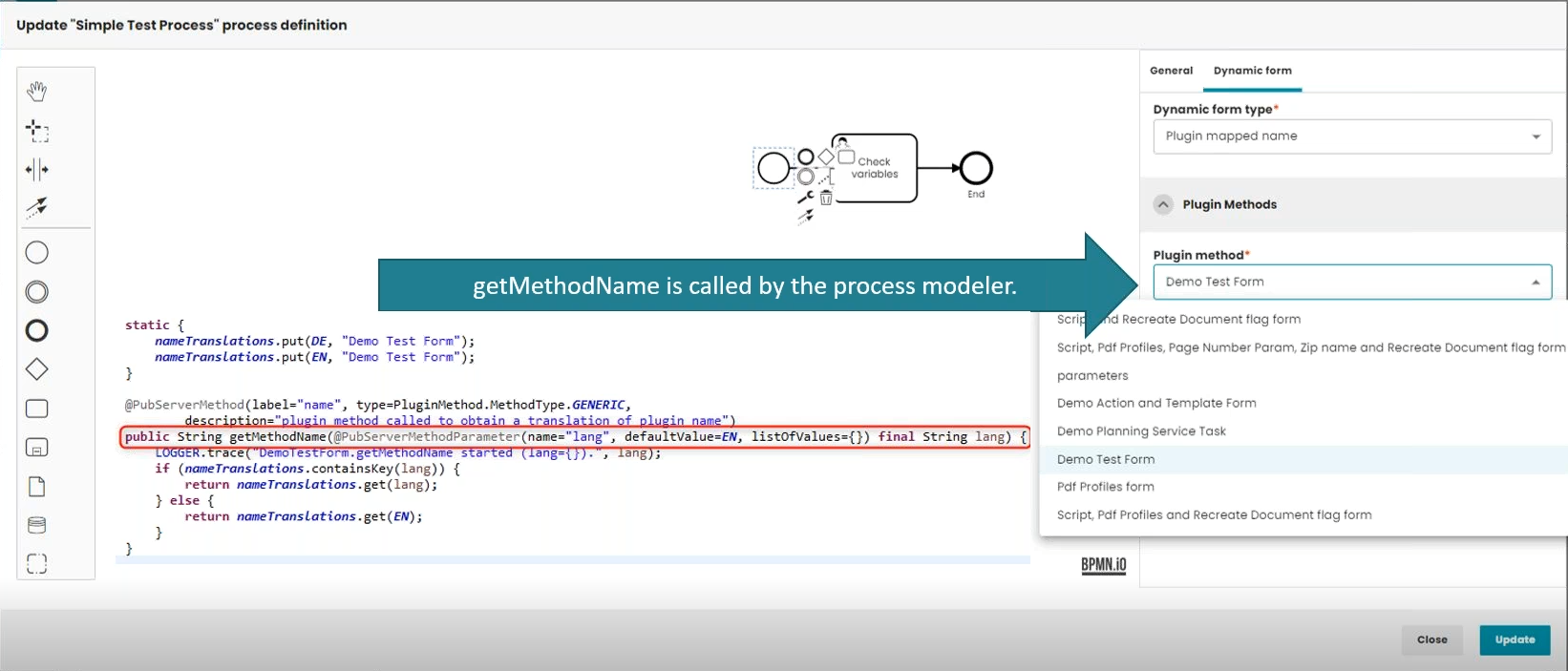 a) getMethodName - used to provide the name of the method. It can then be chosen in the modeler inside Neowise. To choose the right method it is necessary to go to the Dynamic Form tab of the User Task and choose Plugin mapped name from the Dynamic Form Type combo-box.
