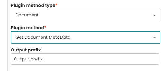 The method retrieves meta data of a document inclusive name, created on, updated on, updated by, created by id, source document id, source document name, master document id, master document name and the document parameters. It has additional string parameter "prefix". It creates new or use existing process variables which names are built by the prefix and the identifiers of the parameters and set their values to the values of the document variables.