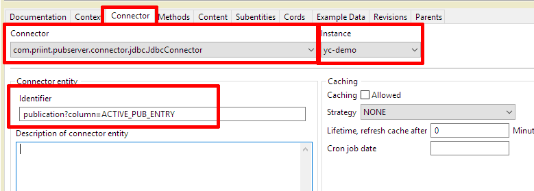The connector uses a "connector entity identifier" string to build queries for the content system. The semantics of this string are defined within the connector and not controlled by the publishing server. The parsing and interpretation of the string is a task of the connector. Details are given below.