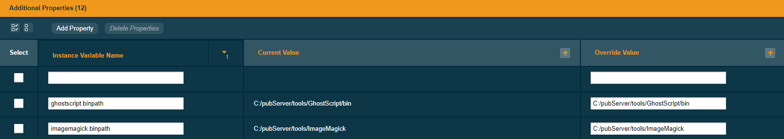 - Add or edit property "imagemagick.binpath" and set value to "C:/pubServer/tools/ImageMagick".