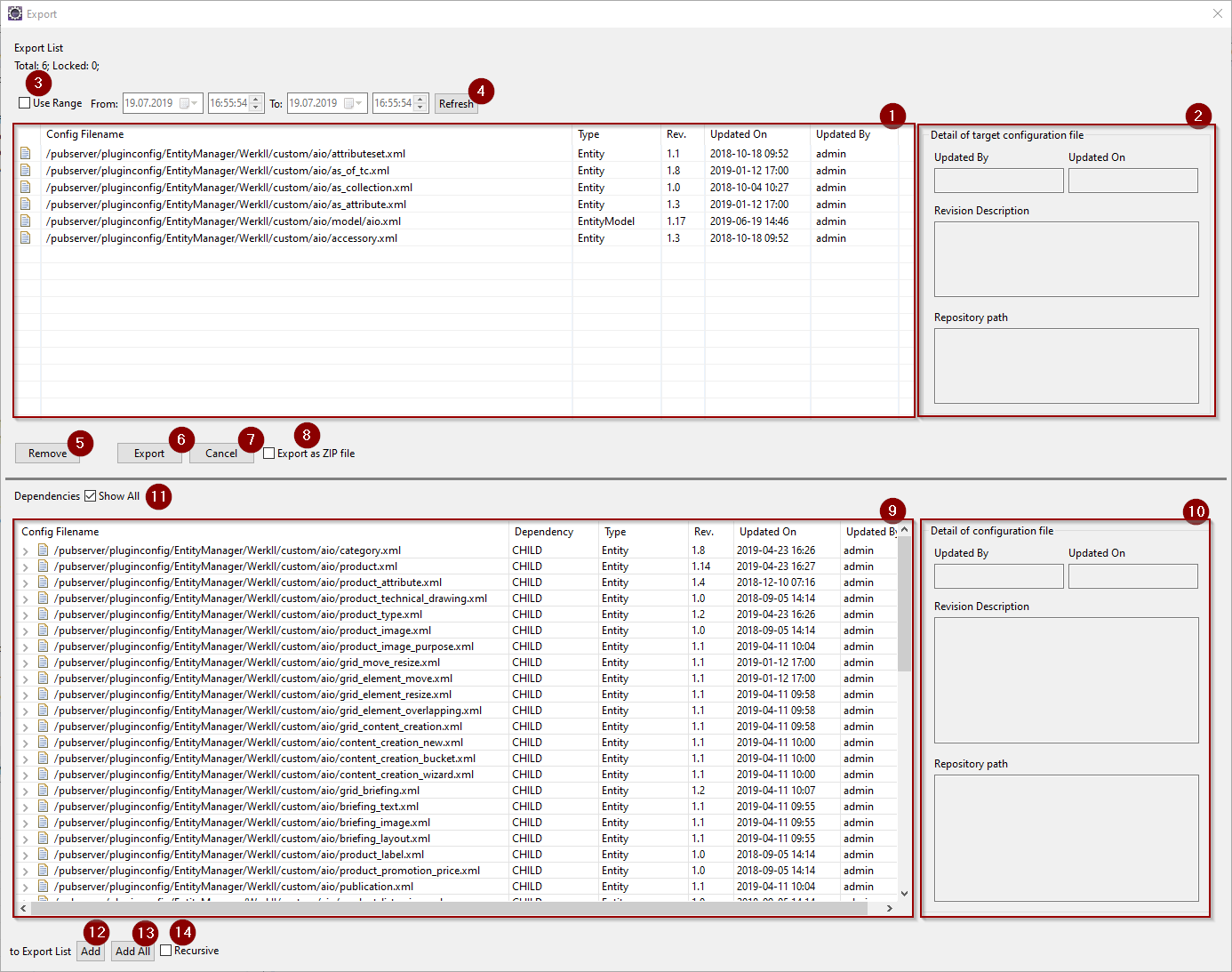 The lower table Dependencies (9) helps you to find all dependent configuration files. If Show All (11) is set, it lists all dependent files for all files in the Export List. If not set, it only lists the dependent files of the selected files in the Export List. You can add files from the lower list to your export set with Add (12), adding the selected files in the Dependencies table, or Add All (13), adding all files in the Dependencies table. Setting Recursive (14) controls, how the dependencies of the dependent files are handled. If set, these are also added to the Dependencies table.
