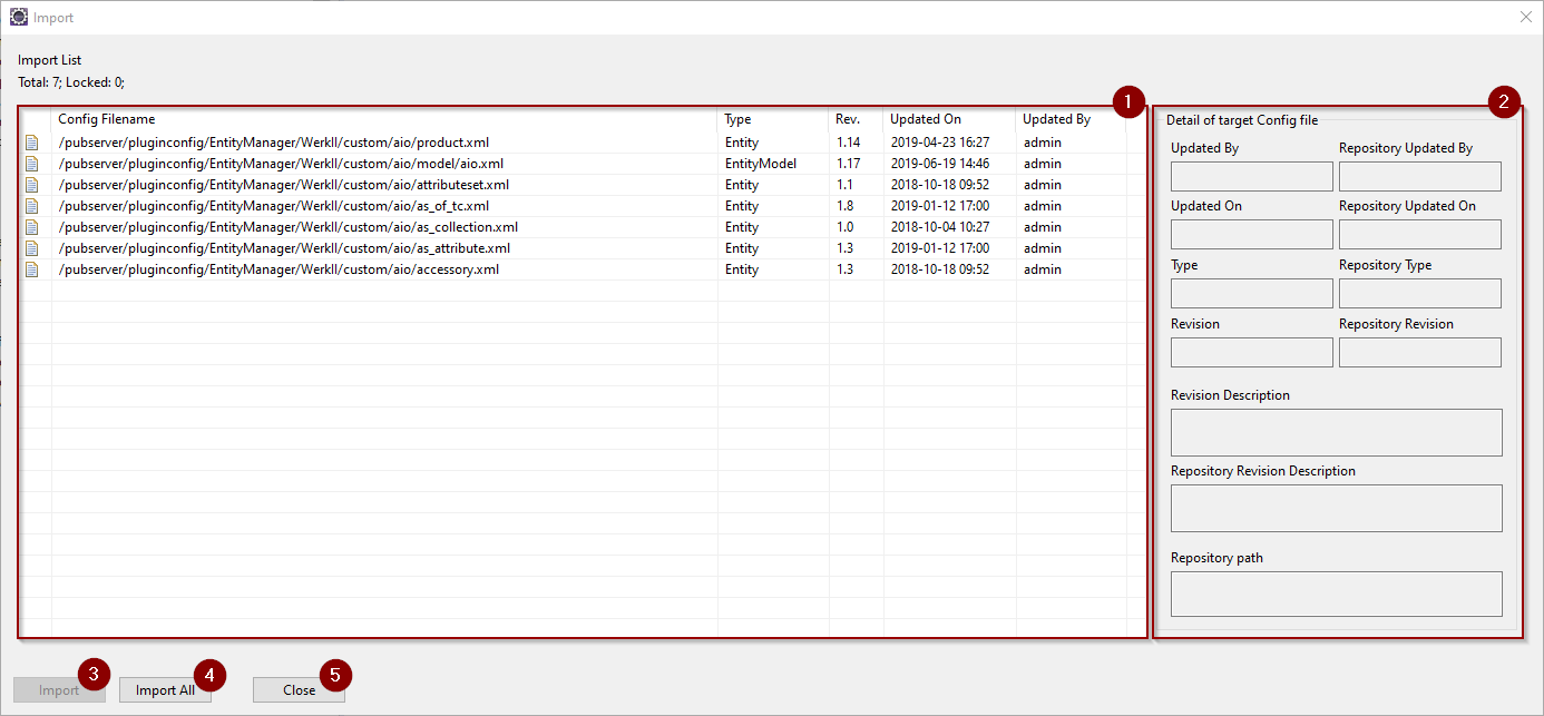 The Import List (1) shows all files found in ZIP or folder structure. If a entry is selected, in (2) details about the files are shown. The details stem from the file metadata.xml. You can import selected entries with Import (3), or import all files with Import All (4). Files you imported are removed from the list. You must close the dialog with Close (5).