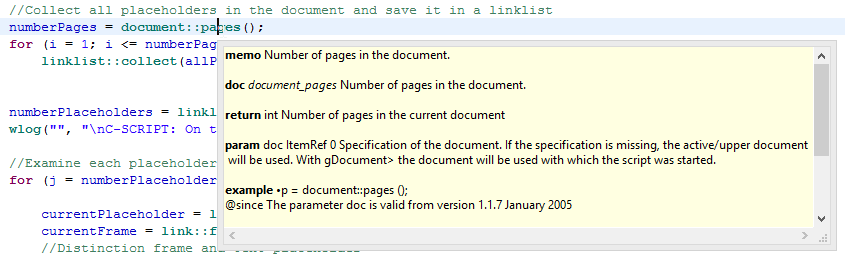 The documentation of the CScript API is also available in the editor. Set the cursor into an API element and shortly wait. A tool tip will display the explanation of the element.