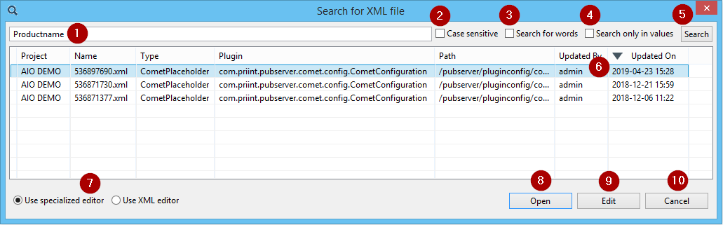 - Text field for the search phrase. The search phrase is compared against the configuration files in the node/folder of the Explorer. The whole XML content is compared, except you select (4).