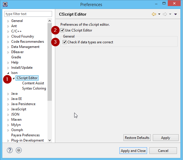 In the left pane select the section Ison. The most important setting concerns the CScript editor. You can decide whether the specialized CScript editor (checkbox checked) should be used for editing CScripts, or a standard text editor (checkbox unchecked). Read the chapter Editing CScripts for the properties of the CScript editor.
