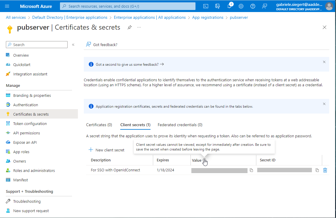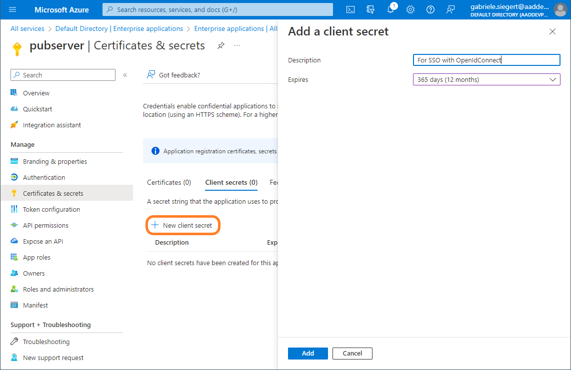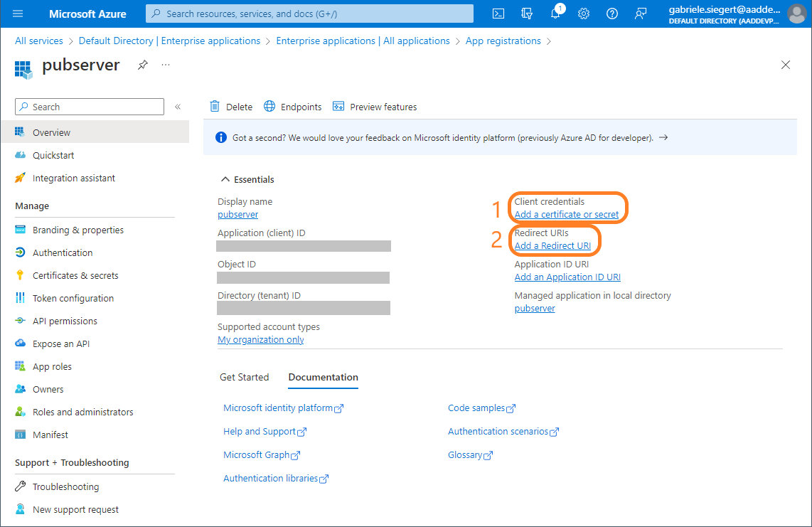 The external identity provider must be configured as well to work together with the Pubserver. The exact steps required depend on the provider you use. Here we show some of the steps registering a Pubserver with Microsoft Azure Active Directory as an example. Please refer to the documentation of Microsoft Azure Active Directory or the external identity provider you need for more details.