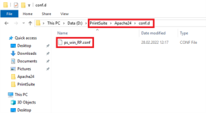 We unzipped the archive earlier to the directory D:\\PriintSuite\\Apache24. First, we want to preserve the original config under D:/PriintSuite/Apache24/conf/. We’re just going to change the ending of the file from .conf to .conf.bak After that, we take the httpd.conf that we provided and copy it to D:/PriintSuite/Apache24/conf/.