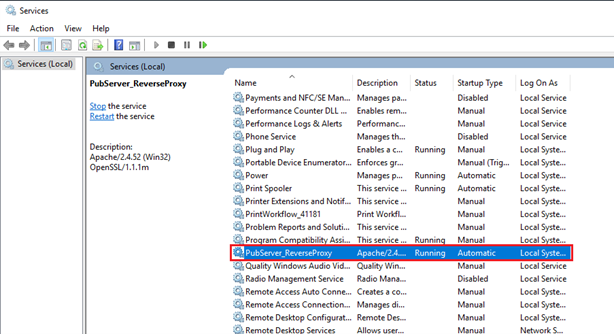 This will create a Windows service with the name PubServer_ReverseProxy which you will use to start, stop and restart the Apache web server.