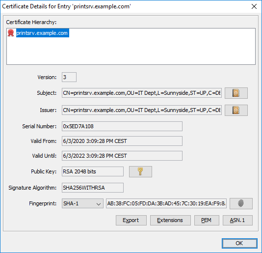 Open the certificate file you got in JKS Explorer. For our example here we use the file “printsrv.example.com.p12”. But JKS explorer allows other file formats as well, like PEM or CRT etc. JKS explorer will normally ask for a password. The password Is typically sent together with the certificate file. Or ask the customer IT that created the certificate.