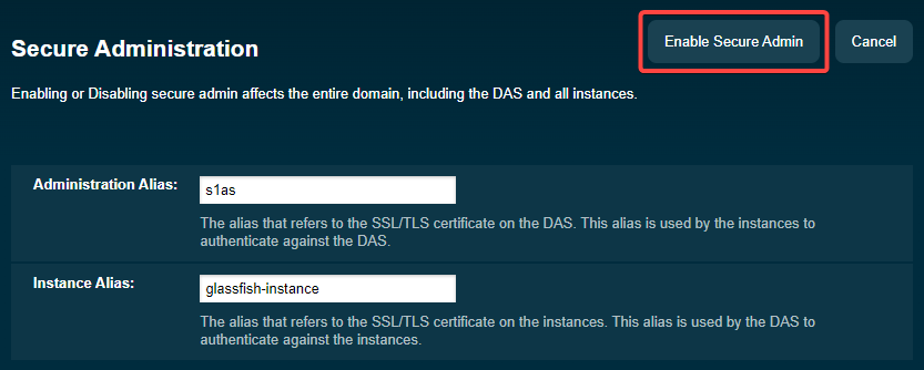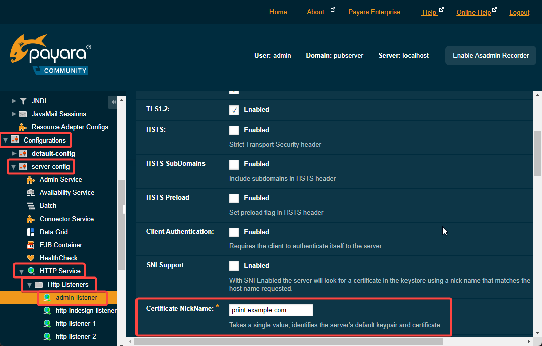 The screenshot below shows where to find the SSL options for the “admin-listener” in the Glassfish/Payara administration. The default nick name is “s1as”. Change to the same alias that was used for “http-listener-2” and save. No restart needed. If the certificate.create.bat script was used to create the certificate, the name will be the common name (CN) of the certificate.