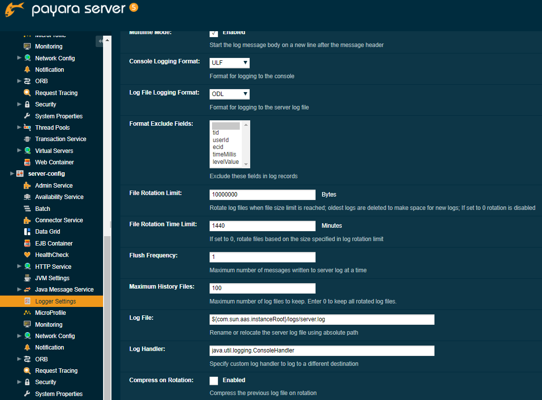 | ‑Dcom.sun.enterprise.server.logging.max_history_files | 10 | Number of logfiles that are written in the log file rotation. |