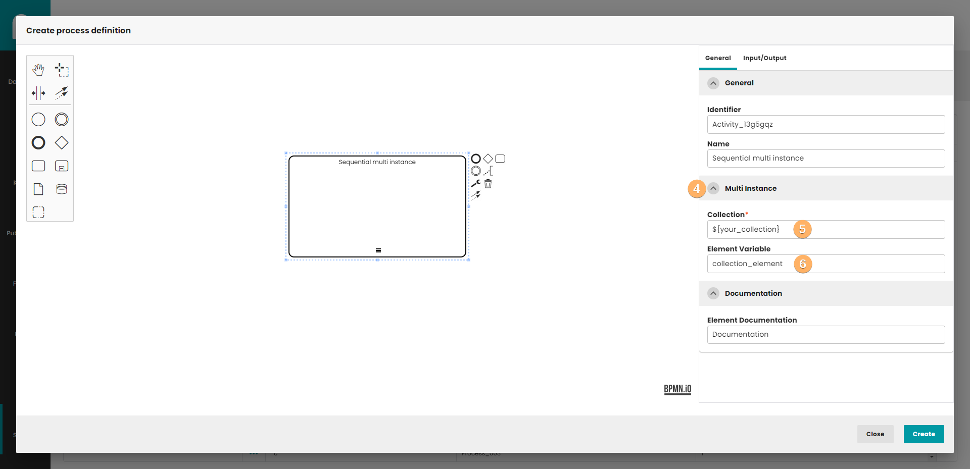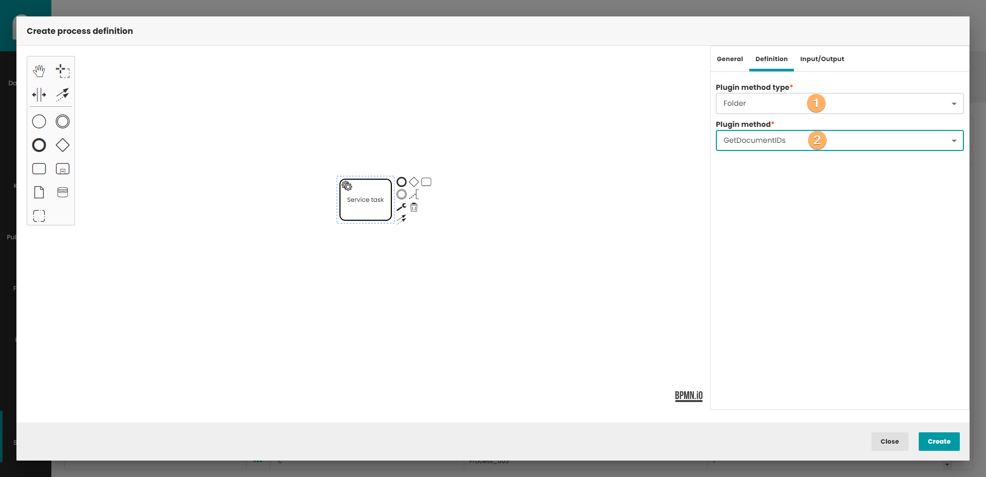 - Create process definition button. When you click on this button, process definition will be saved in database. The process do not need to be finished. If you edit process definition, the Create button is replaced by the Update button. Update button create new version of process definition, so you can easily go back to previous version of process.