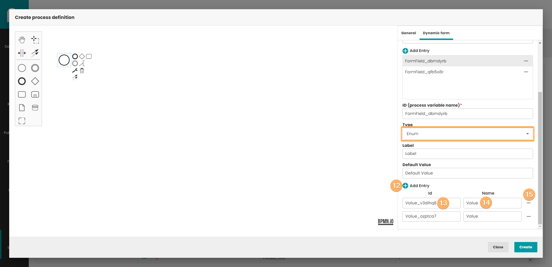 - Field default value. Any value can be set, except where enum is specified as the type. Then the value has to be set to match the existing id in the enum list.