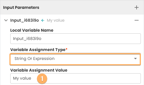 - This field is dynamic and looks different for each type of parameter. In this case it is a text field because the type selected is String Or Expression.