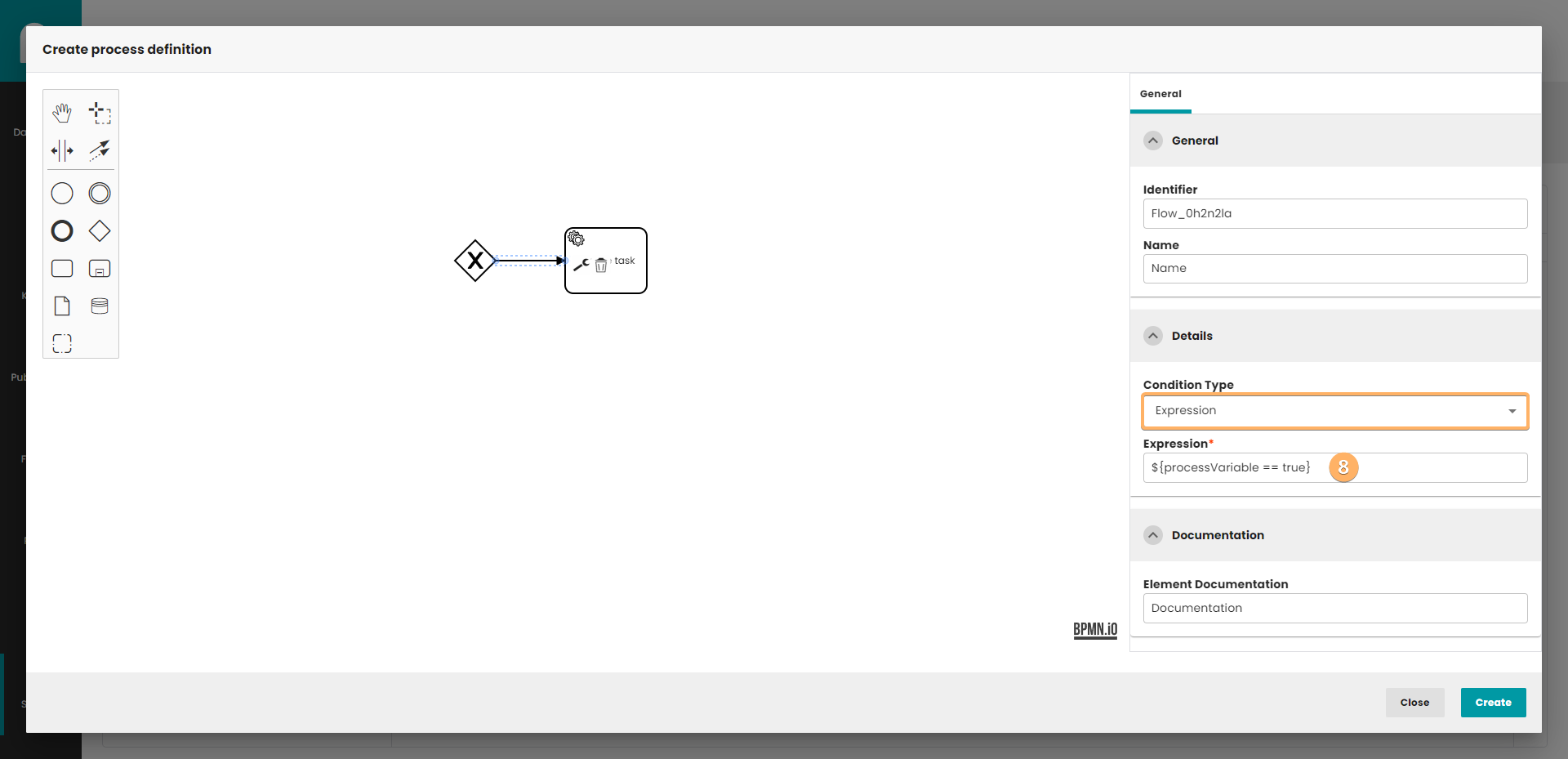 - Expression defines when a flow is taken. It is a boolean expression that can access the process instance variables and compare them with literals or other variables. The condition is fulfilled when the expression returns true.