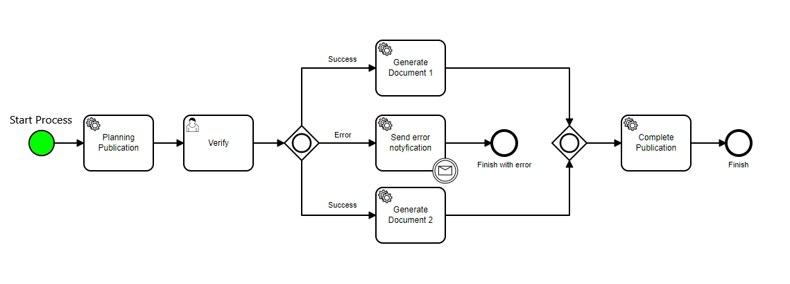 This element is represented by a circle in the diagram. It is used to start the process instance. It contains a number of functionalities that can be set during process startup. Those functionalities can may affect the process fate.