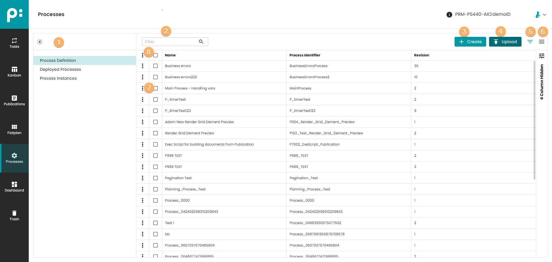 The Process Definition grid allows for creating, uploading and editing processes. Every time the user saves a process, a new revision will be created.