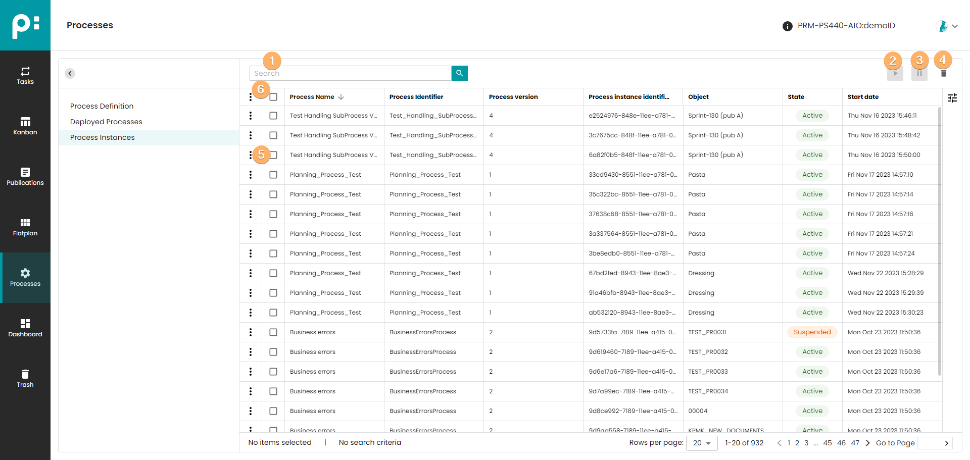 - The multi-selection context menu allows to suspend, resume or delete the process instance.