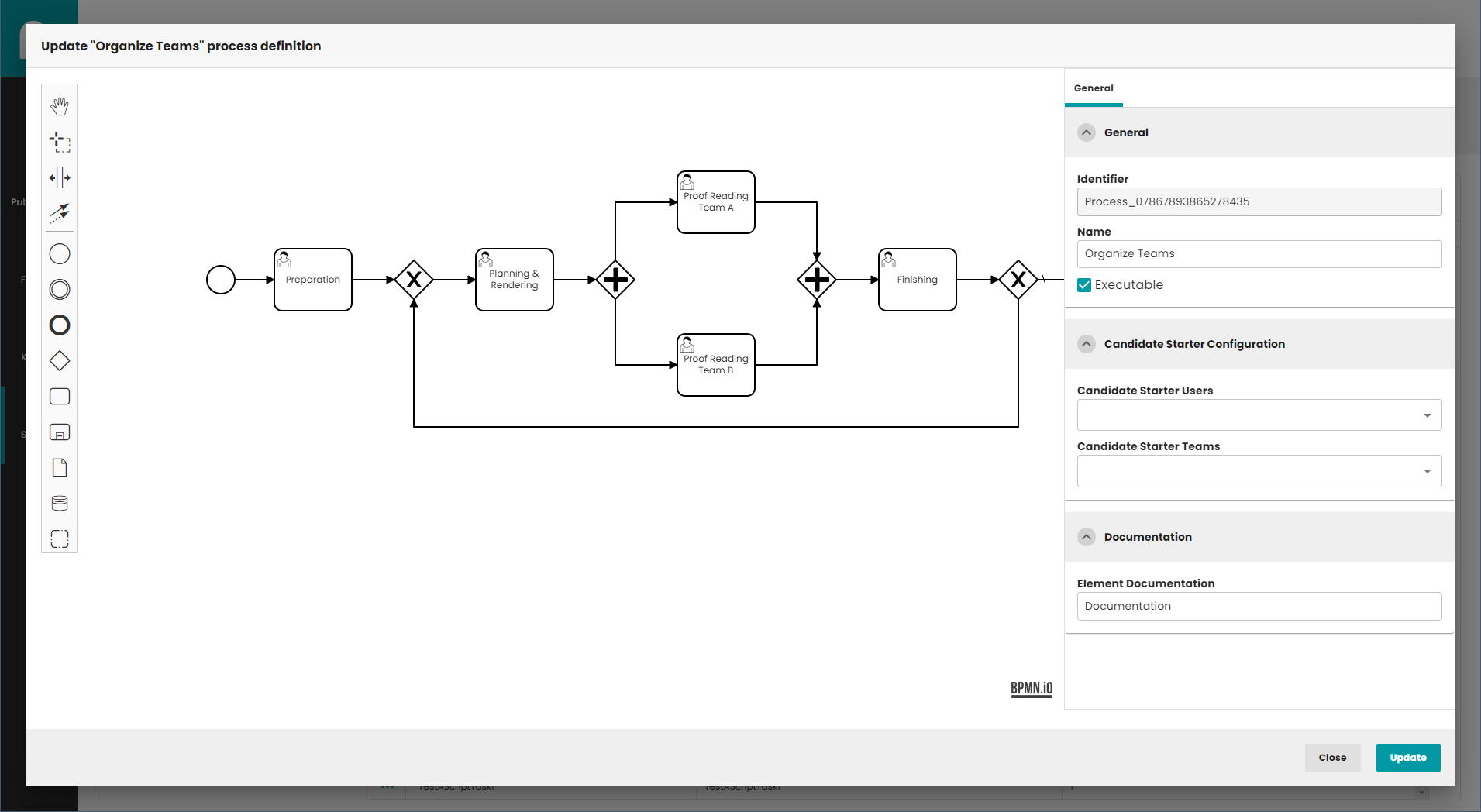 - Upload a process definition (a file of type BPMN) which was created externally. The process editor will open with the uploaded process. There you can further change the process, or just save it by clicking the Update button.