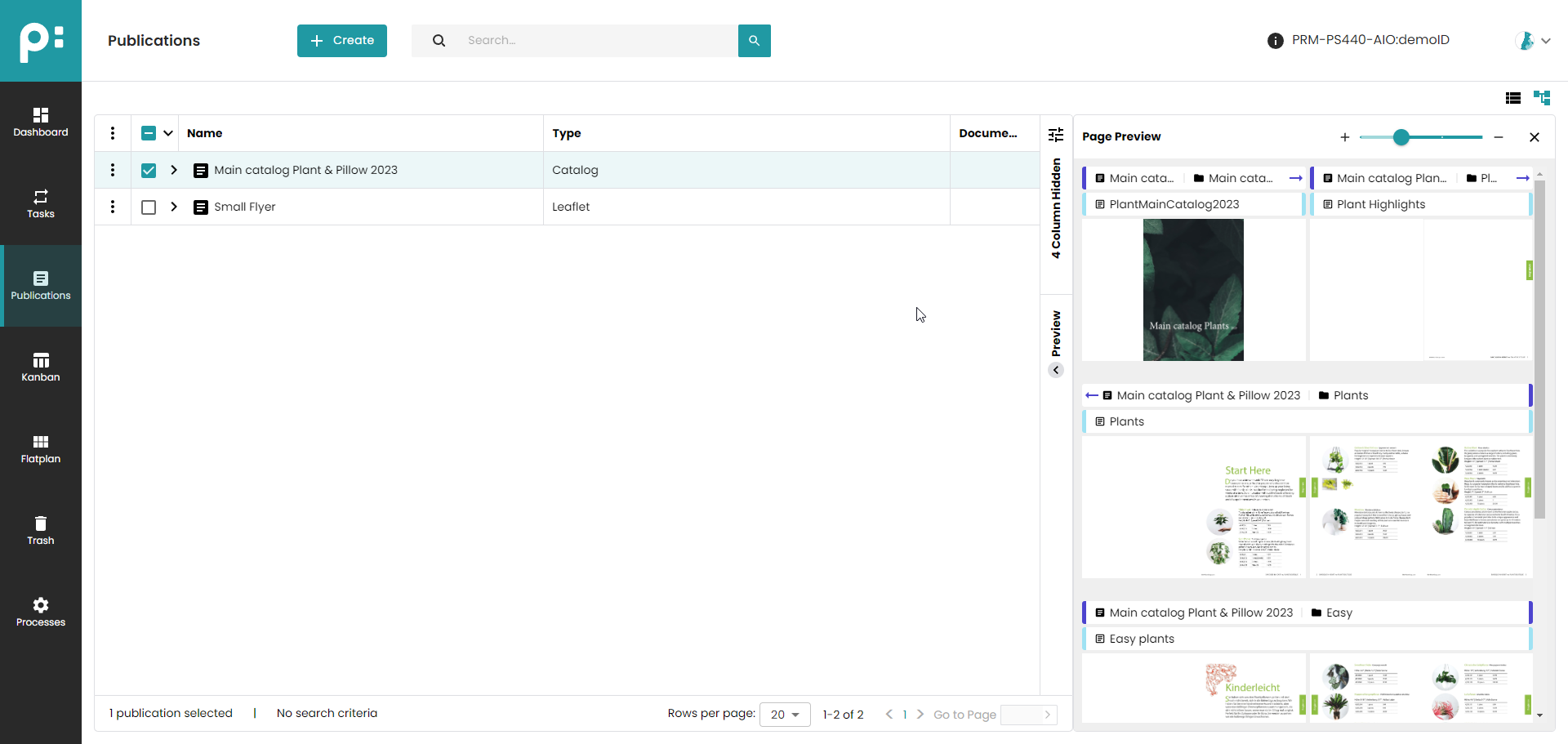 If the user selects publications, folders or documents, the Preview panel is available. By clicking on the angle button or on the lettering ‘Preview Collapsed’ the preview panel on the right side opens. The document pages are displayed. Zooming is done via the zoom selector. Its setting defines how many columns are displayed. You can vary between one (+) and four (-). Clicking the x button, the angle button or the lettering 'Preview' closes the preview.
